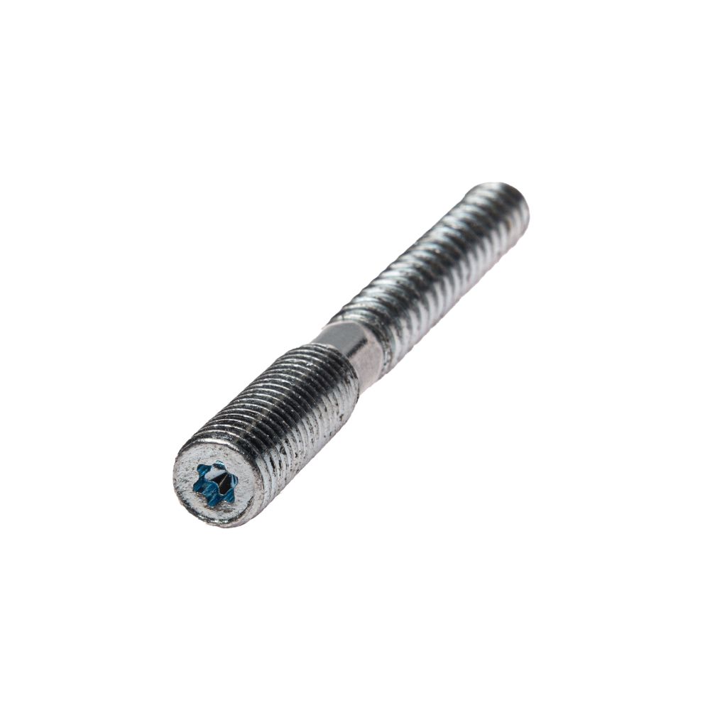 Для производства шпилек используется оцинкованная сталь. Оцинковка защищает от коррозии и позволяет применять крепеж в условиях повышенной влажности. У шпильки форма заостренного с одного конца стержни. Шляпки нет. Метиз сочетает участки с разной резьбой: с винтовой с заостренного конца и с метрической – с тупого. Между этими участками шестигранная перемычка. Предусмотрен внутренний шлиц TORX для затягивания крепежа.