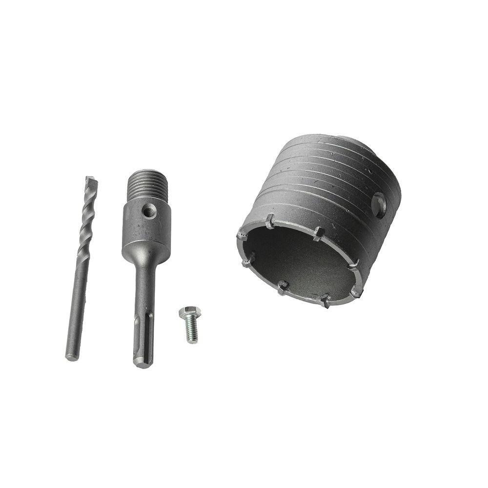 Твердосплавные зубья из сплава марки ВК8. Корпус коронки изготовлен из углеродистой стали. Хвостовик SDS-PLUS. Резьбовое крепление коронки к хвостовику. На внешней стороне коронки нарезана спиральная канавка для улучшения вывода продуктов сверления и снижения нагрузки на перфоратор